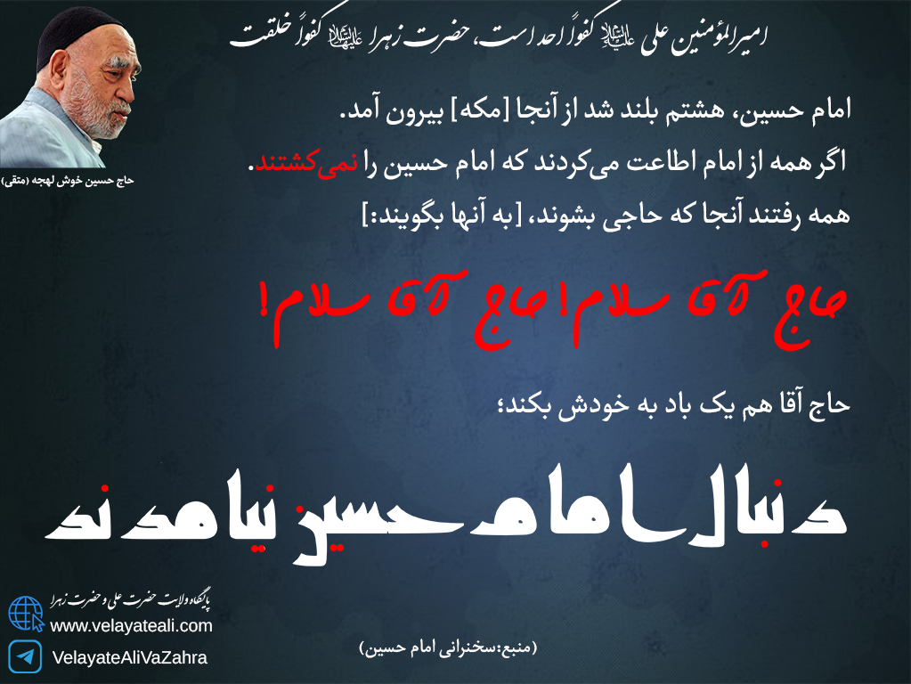 امام حسین، هشتم بلند شد از آنجا [مکه] بیرون آمد. اگر همه از امام اطاعت میکردند که امام حسین را نمیکشتند. همه رفتند آنجا که حاجی بشوند، [به آنها بگویند:] حاج آقا سلام، حاج آقا سلام. حاج آقا هم یک باد به خودش بکند؛ دنبال امام حسین (علیه السلام) نیامدند