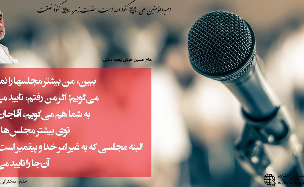 ببین، من بیشتر مجلسها را نمیروم، میگویم: اگر من رفتم، تایید میشود. به شما هم میگویم، آقاجان من، توی بیشتر مجلسها نروید. البته مجلسی که به غیر امر خدا و پیغمبر است نروید. آنجا را تایید میکنی.