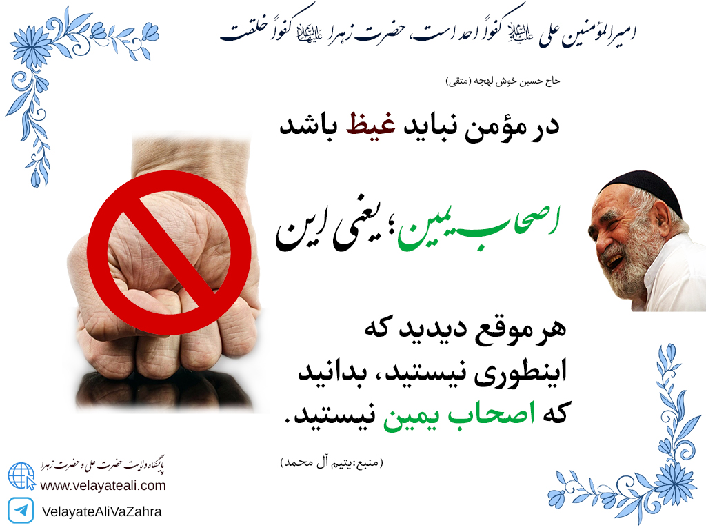 در مؤمن نباید غیظ باشد. اصحاب یمین؛ یعنی این. هر موقع دیدید که اینطوری نیستید، بدانید که اصحاب یمین نیستید.