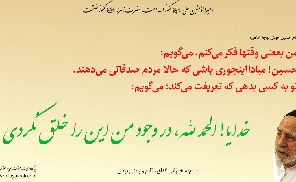 من بعضی وقتها فکر می‌کنم، می‌گویم: حسین! مبادا اینجوری باشی که حالا مردم صدقاتی می‌دهند، تو به کسی بدهی که تعریفت می‌کند. می‌گویم: خدایا! الحمد لله در وجود من این را خلق نکردی.